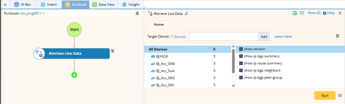 Tip: If a runbook has already been opened, the Retrieve Live Data node will be added to the current Runbook; otherwise, it will be added to the personal Runbook. - Select the target devices. By default, this action applies to all existing devices on the map. To customize target devices, click the