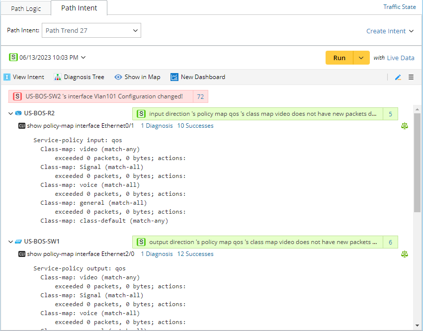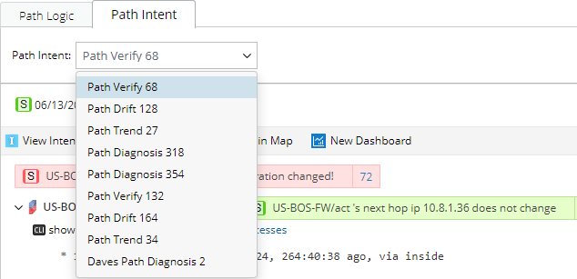 After creating a path intent, you can run the intent and view the results in the Path Intent pane. All the path intents added to the path are listed in the Path Intent list. You can select one and its intent details will be displayed in the Path Intent pane.