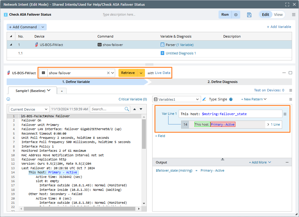 - Build an intent to parser the key metric of data obtained by command show failover.