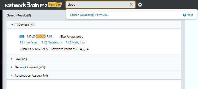 Note: In the search results, the cloud type of the searched-out cloud will be displayed. The NetworkBrain System supports five cloud types: MPLS L3 VPN, AWS Public Service, Google Cloud Public Service, Aryaka DC Cloud, and Internet Cloud.