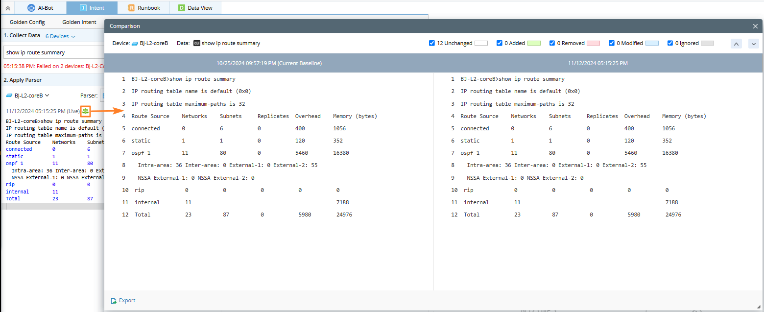 For example: Devices CA-TOR-R1 and CA-TOR-SW1 are matching devices as they have the selected command show ip route summary, but the device CA-TOR-SW2 is not.