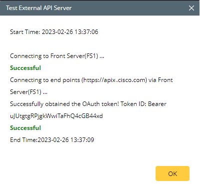 - Click Test to initiate a connectivity test between the NetworkBrain front server and the Cisco SNTC API configured.