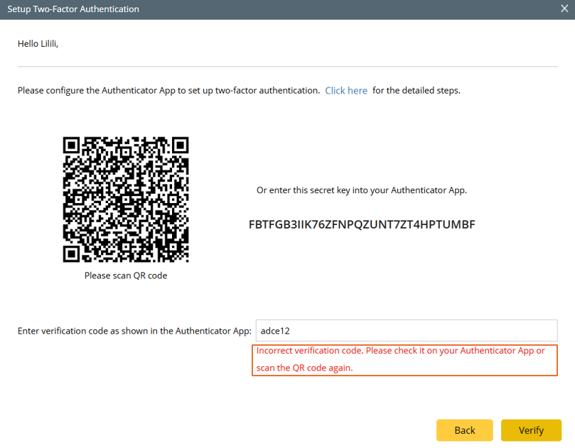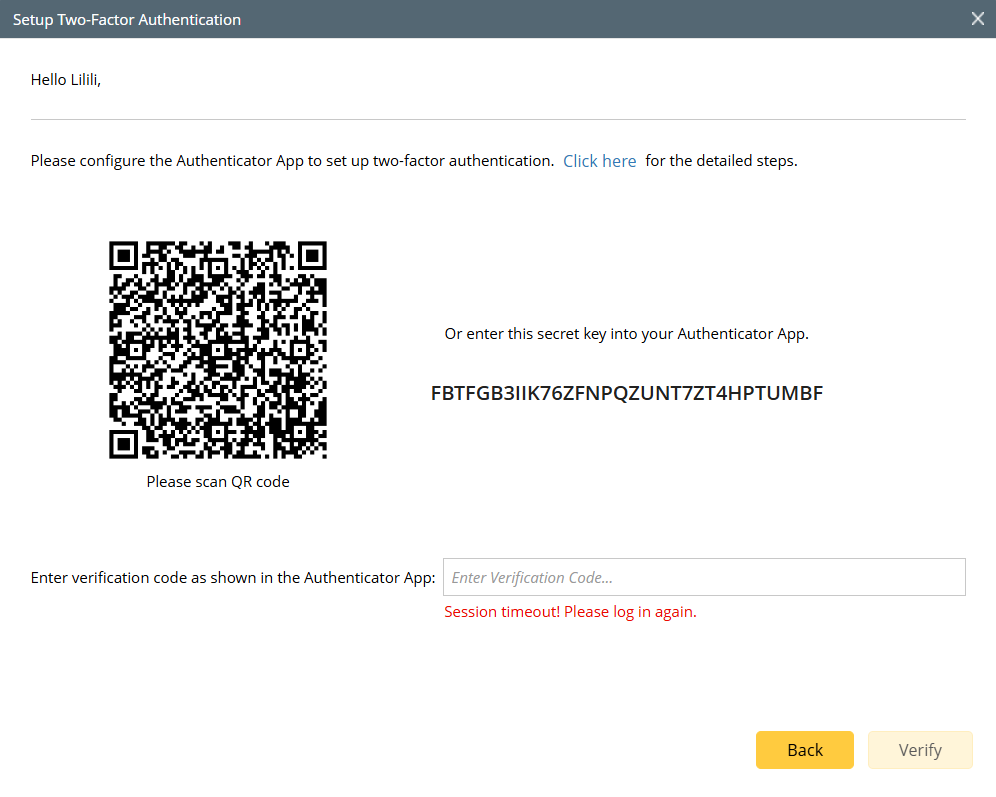 - Enter the verification code in the window, then click Verify to verify identity. The verification code is a 6-digit number that refreshes every 30 seconds. You must enter the most recent code to proceed.