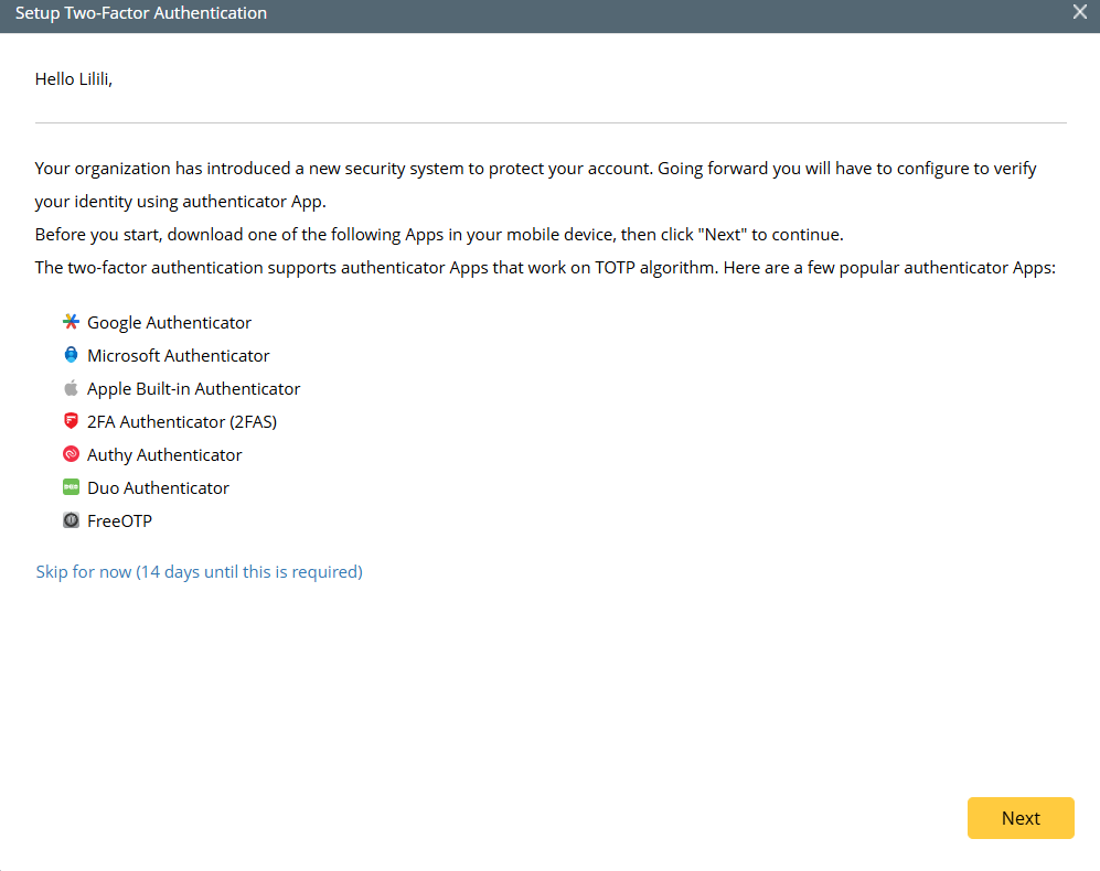 - The Setup Two-Factor Authentication window will pop up if username/password are correct. A brief note of Two-Factor Authentication setup is shown. Make sure you have downloaded an Authenticator App. Click Next, then you will move to step 4. If you are not ready to set up two-factor authentication yet, you can move to step 3.