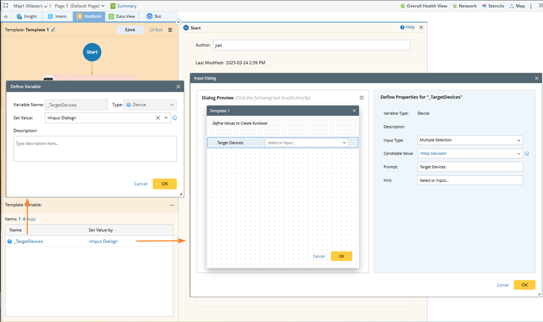 You can define the variable name and type, and set value for each type of template variable. The Input Dialog option controls whether the current variable value is user-defined or assigned through the input dialog. By default, this option is not selected. Once selected, the variable will appear in the input dialog and be assigned a value.