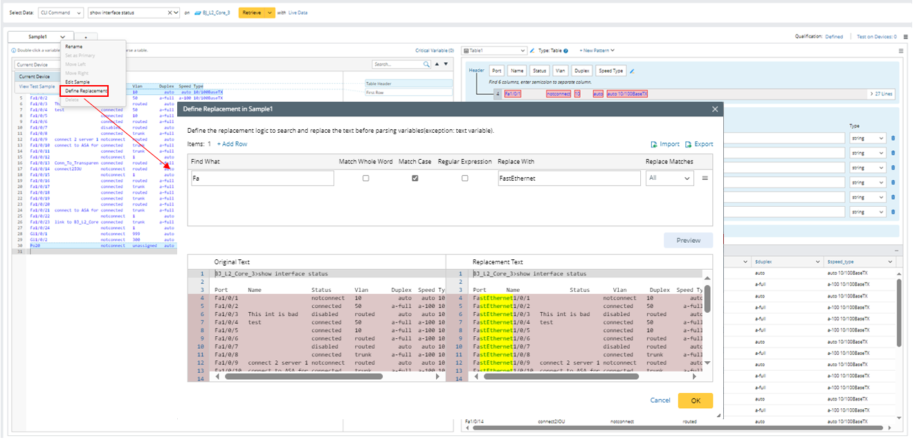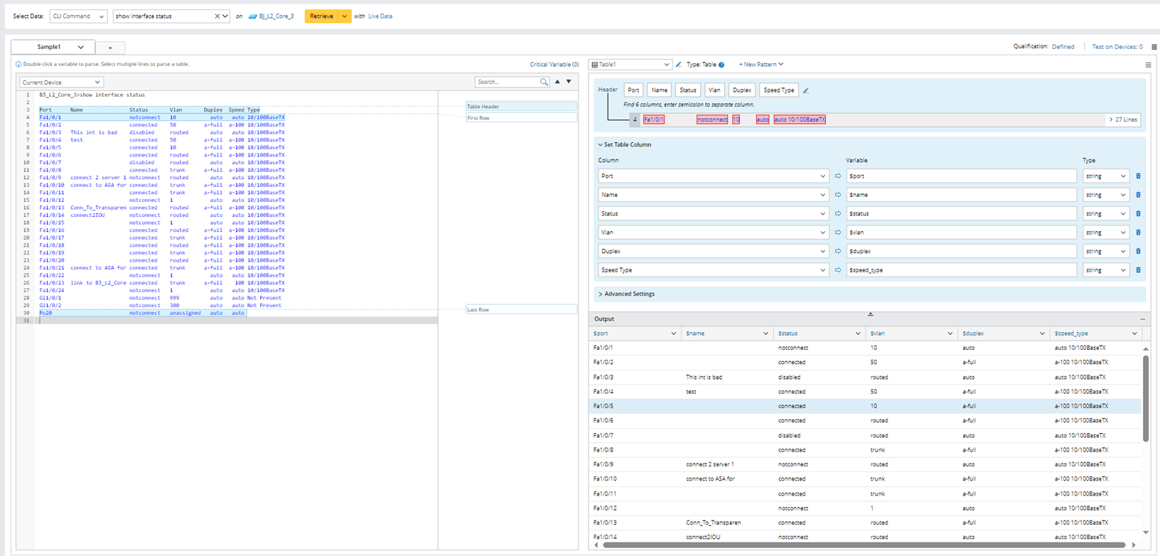 - Retrieve command data “show interface status” on the device BJ_L2_Core_3, then select several lines from the sample text to parser table. The interface name is short name in the parsed results.