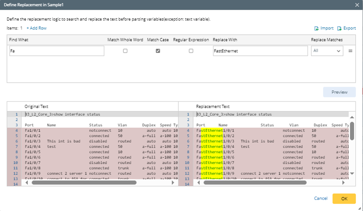 - Click +Add Row, then set to replace Fa with FastEthernet. The meanings of the options are described below: