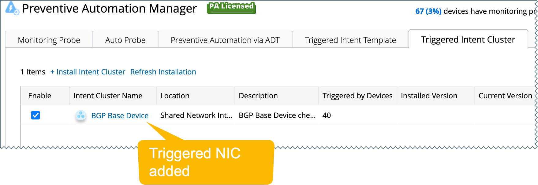 Member NIs of a NIC can be run manually. However, the better use case is that NIC is triggered by an external ticket, which requires adding NIC to the internal probe. Install the NIC to a probe using Triggered Intent Template in the Preventive Automation Manager as follows: