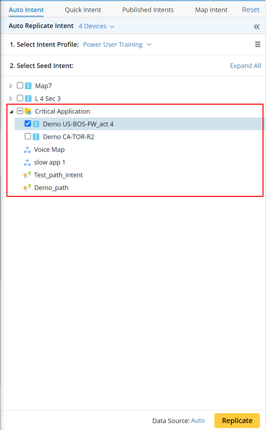 As ADT and ADT assets (intents/maps/paths) can also be listed in Auto Intent, Auto Intent can function to deliver intents, path and map from ADT. For ADT installed in Auto Intent, its path, intent, path map associated with the map devices are filtered and listed under the ADT folder. End users can select intents for diagnosis or directly use the path or map to carry out troubleshooting.