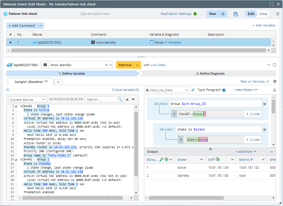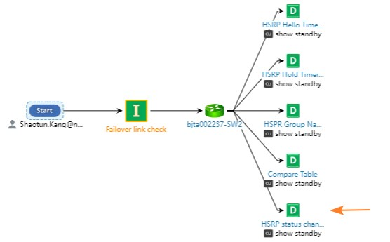 - Create a NI “Failover link check” and add CLI diagnosis for device “bjta002237-SW2”. Get a parsed table by command show standby.