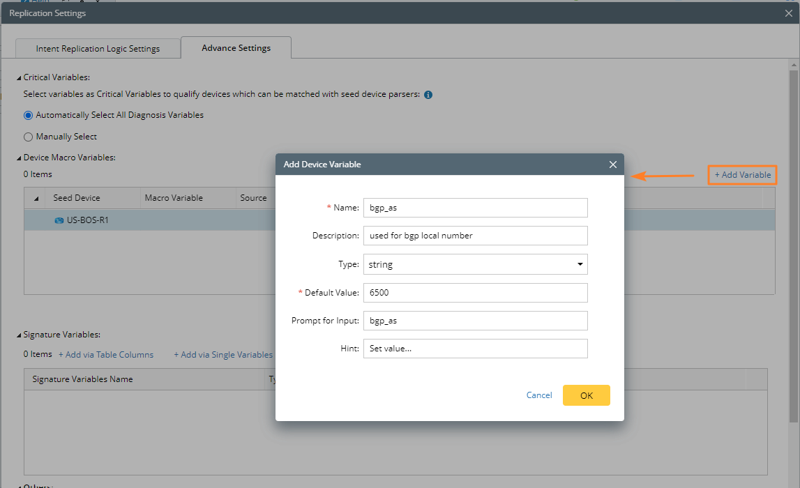 - On the Advanced Settings tab, define device macro variables, which are used in NI diagnosis conditions. For example, device variables can be defined as BGP AS numbers.
