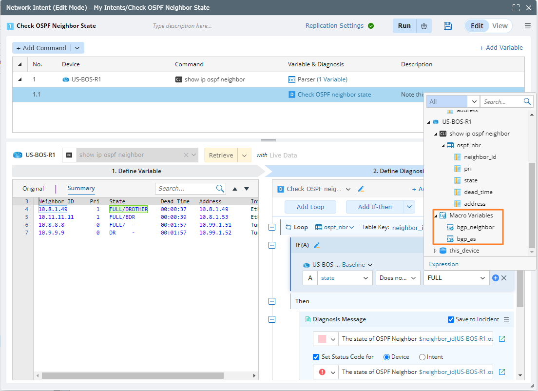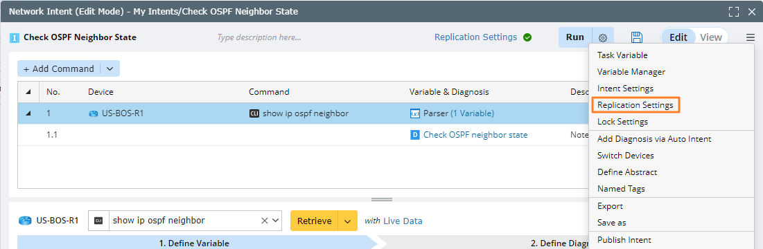 On the Intent Replication Logic Settings tab, define the command macro variables, which are macro variables used in CLI commands. For example, show $ospf_neighbor_ip. See Define Command Variable for more details.