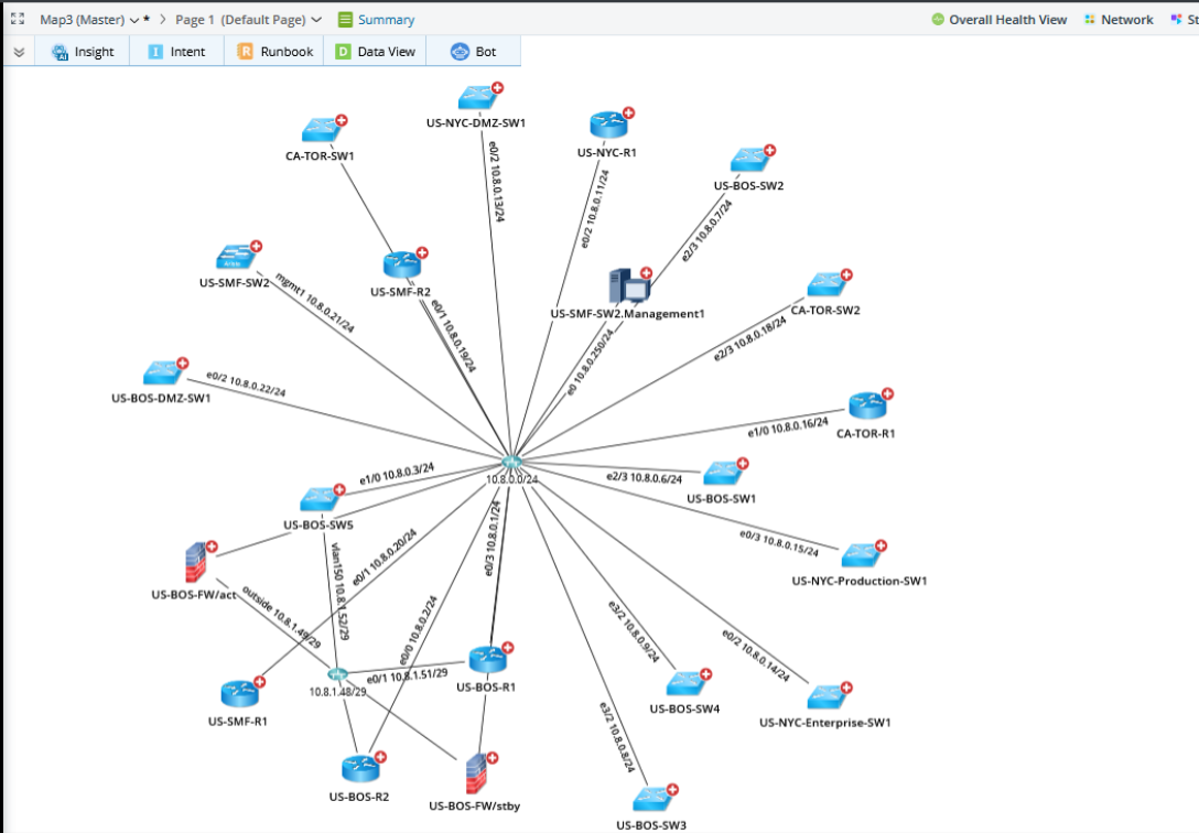 - Runbook: Open the runbook pane to view and execute automated diagnostic procedures and workflows tailored to the network map.