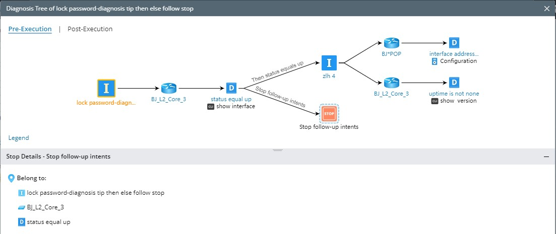 Stop node exists in both pre-execution and post-execution modes, displaying the summary of the Stop defined in diagnosis.
