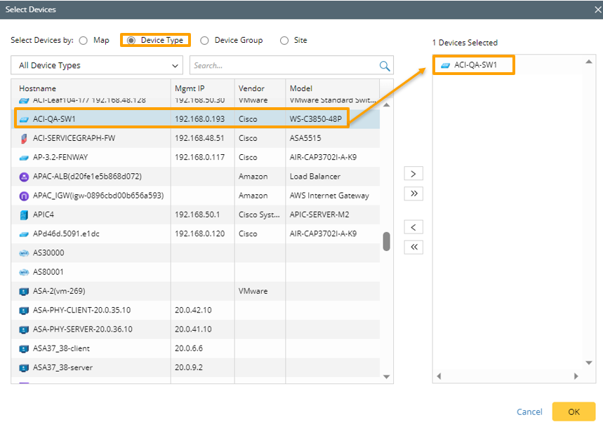 - In the pop-up window, narrow down the scope of devices by selecting one of the Map/Device Type/Device Group/Site options, then select one or more devices from the left pane and click the