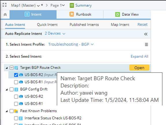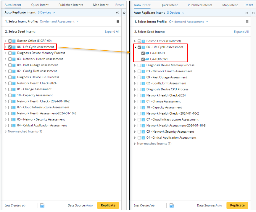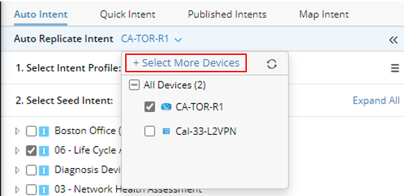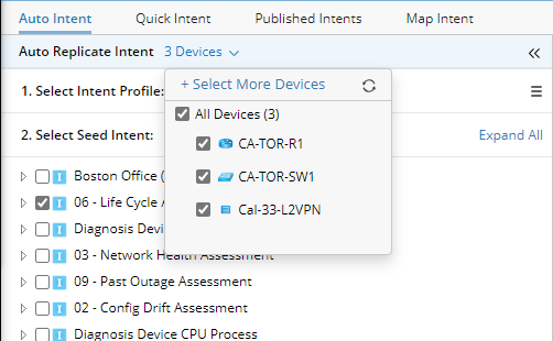 In the Auto Replicate Intent pane, devices associated with the map can be selected to filter intents. By default, all the map devices of the current map are selected. As you check/uncheck devices, the matched intents below change at the same time.