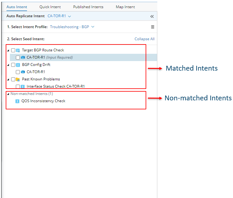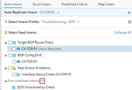 - Non-matched Intents section: The seed intent under the Non-matched Intents section are those defined in the profile but not matched with any map devices. Seed intent in this section are not selectable but are displayed to show what seed intent can be used in selected profile for users’ reference. The total number of non-matched intents is shown.