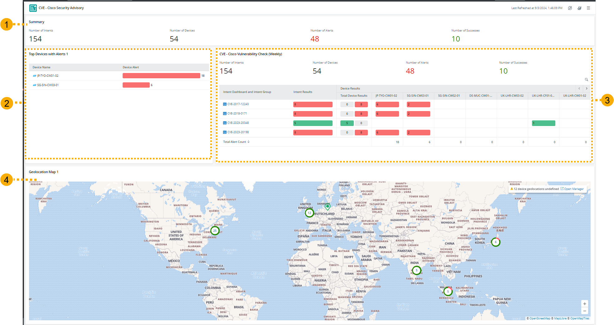 - The alerts are calculated using the device alert status code across Intent Dashboards in selected dashboard groups in the observability dashboard.