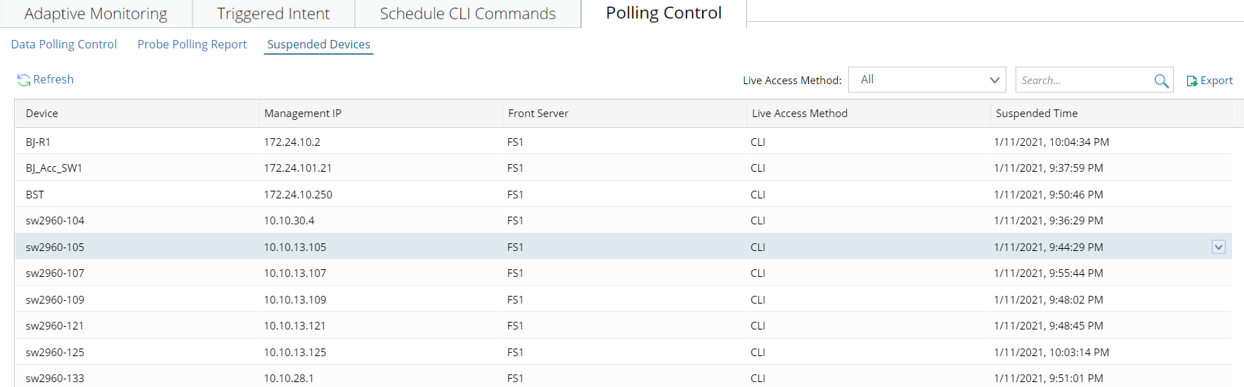 Since the system may use CLI or SNMP to access devices, you will find the corresponding live access methods for each suspended device.
