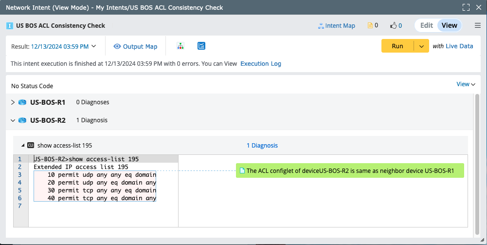 Define a diagnosis on US-BOS-R2 to verify ACL consistency between the two devices by checking the status codes after intent execution.