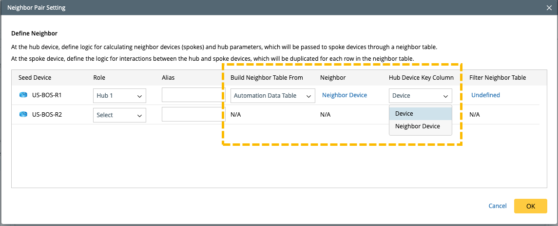 Define the neighbor variable logic for the hub device. In this case, use the Neighbor_Device column from the table to identify neighbors and Device column is set as the hub device key column.