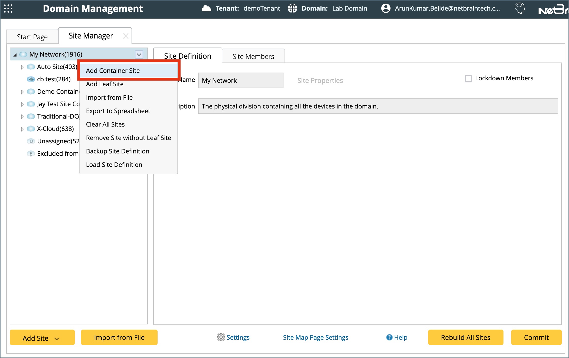 Note: Container Site does not support Dynamic Search and other ways to add devices to the site. You’ll need to add a Leaf Site under the Container Site and use the Dynamic Search or Manually method to add devices to the leaf site. Those devices will automatically show up in the Container Site.
