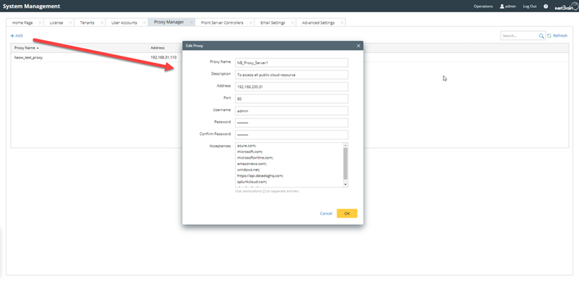 Tip: There is no need to specify HTTP or HTTPS Proxy, as the system will automatically determine the proxy type. - Define the acceptances field by entering the URLs that require Proxy. This field is a whitelist containing the respective IP addresses and URL suffixes.