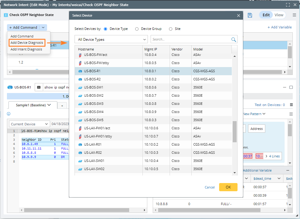 In the NI Edit Mode, select Add Device Diagnosis from the drop-down list of Add Command. And then select a device for the device diagnosis.