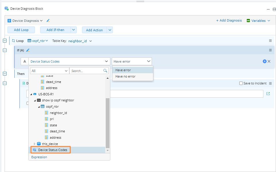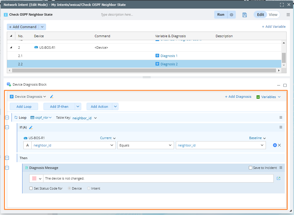 You can define a device diagnosis block without SNMP/CLI/Config/API command, which enables intent to be used as a shell, just to execute the subsequent follow-up intents. This kind of diagnosis can also be used to define the diagnosis based on built-in device data only, e.g., device route table or NCT.