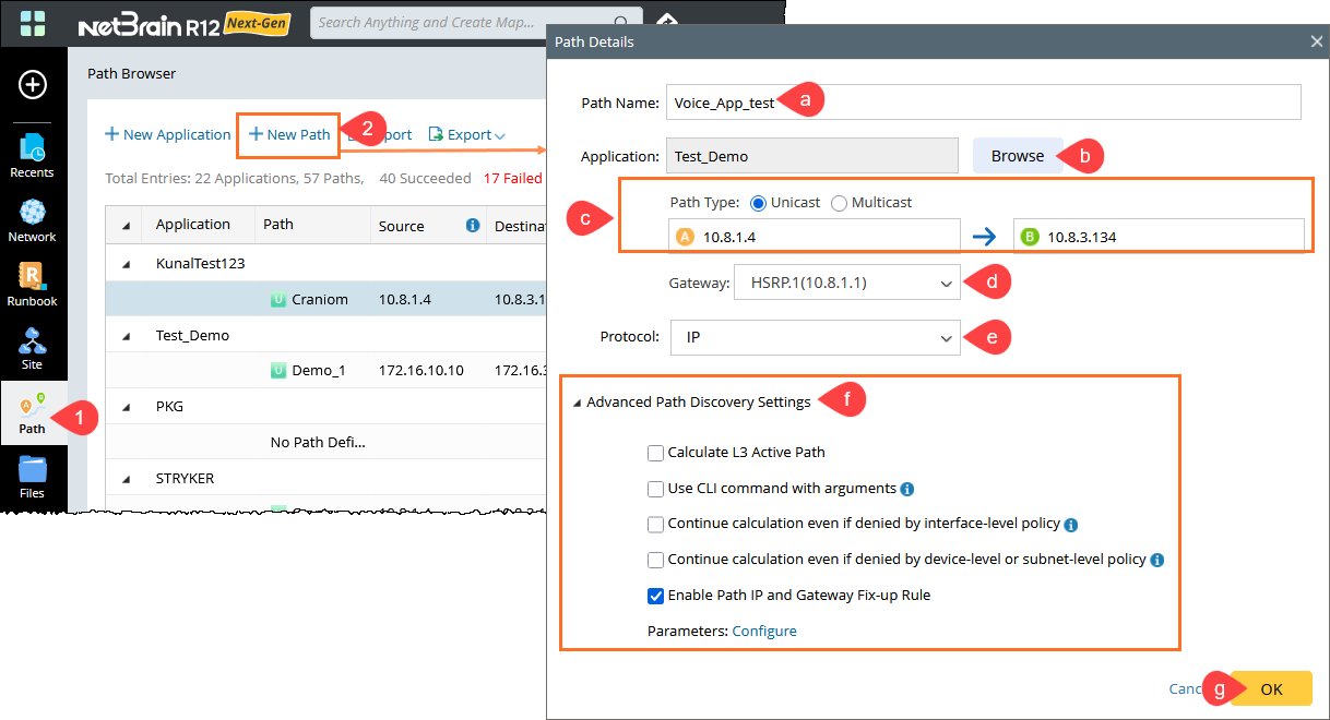 If the desired application is not available, the path is saved under Untitled Application by default. To assign the path to a specific application, you must first create an Application. - Enter the source/destination IP address.