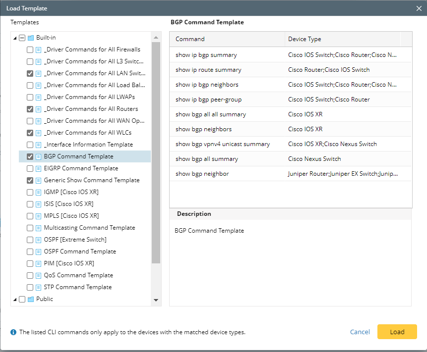 You can also add CLI commands by loading CLI Templates. The system supports selecting multiple CLI templates in the Load Template dialog box.