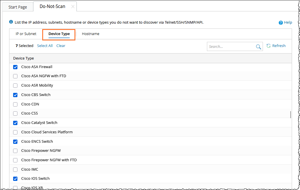 To exclude specific device types from discovery, select their check boxes in the list. You can use the Search function in the Device Type column to quickly locate device types.