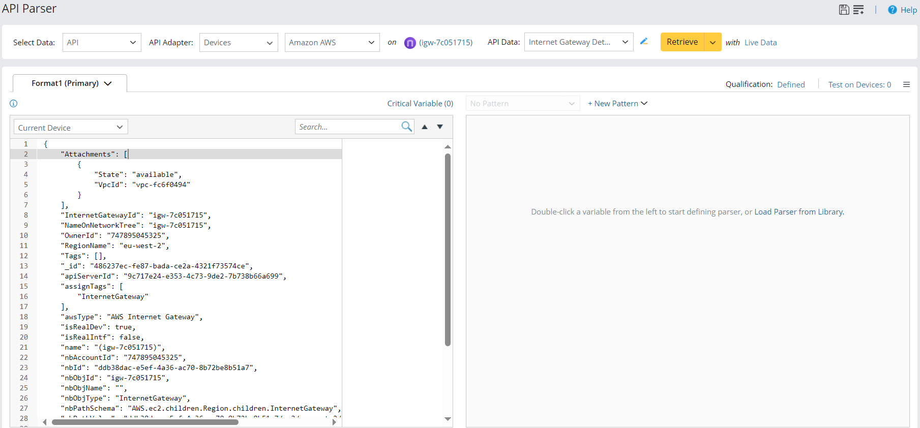 - Select API Adapter as Devices, Amazon AWS, and then select to retrieve data on device igw-7c051715.