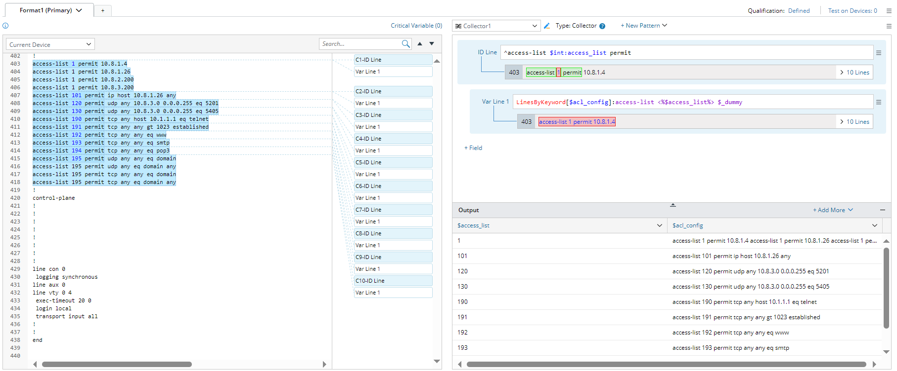 - For Source Table 2: Define a collector pattern to parse the variables $acl_config configured by number.
