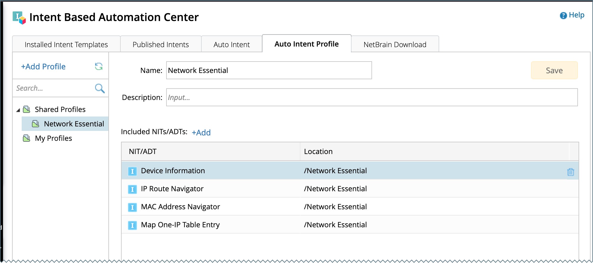 3. Click + Add in the Included NITs/ADTs block, then select an intent to be added to the profile in the pop-up dialog. Click OK in the dialog. The selected intent will be added as an entry to the Included NITs/ADTs block.