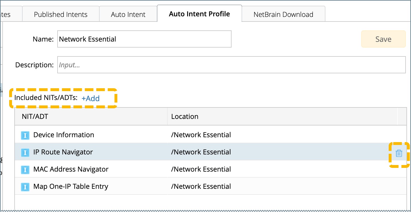 Note: After a profile is selected in the left pane, all the intents included in the profile are listed in the NITs/ADTs block in the right pane. You can click  to remove an entry from the table.