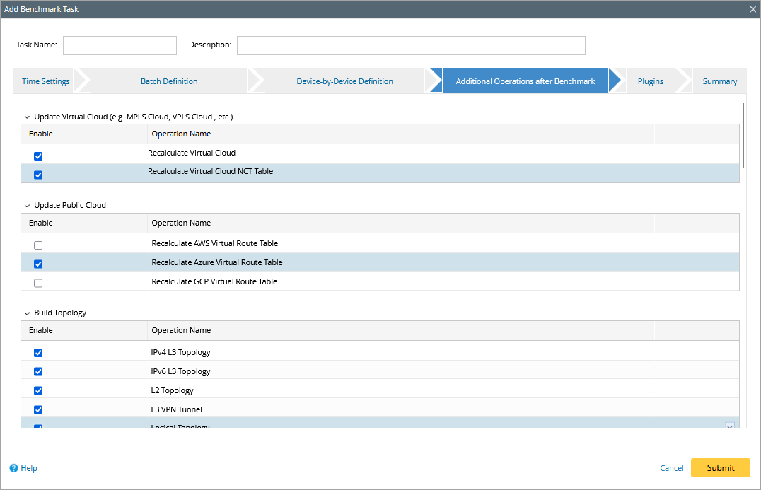 The discovery process only retrieves the basic data of your Azure network and builds L3 topology. After the discovery, you need to set up a NetBrain benchmark task to retrieve all data, including visual spaces and data views. For more Information, see Setup a Benchmark Task.