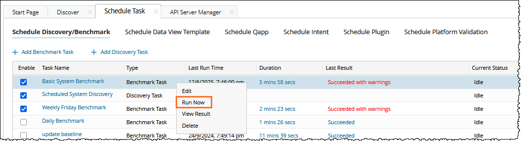 - Right-click on the Benchmark task, click Run Now to trigger the benchmark task.