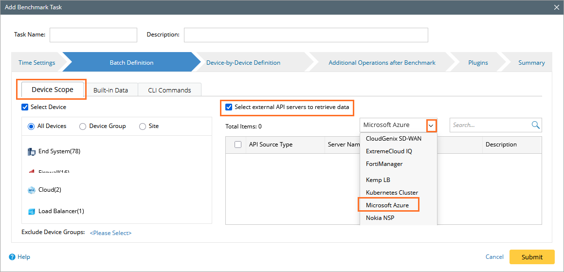 - Go to the Device Scope tab, check the Select external API servers to retrieve data checkbox and select the Microsoft Azure a source type.