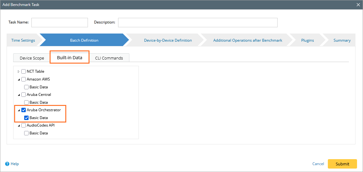 - Go to the Buil-in Data tab, and select the Aruba Orchestrator checkbox.