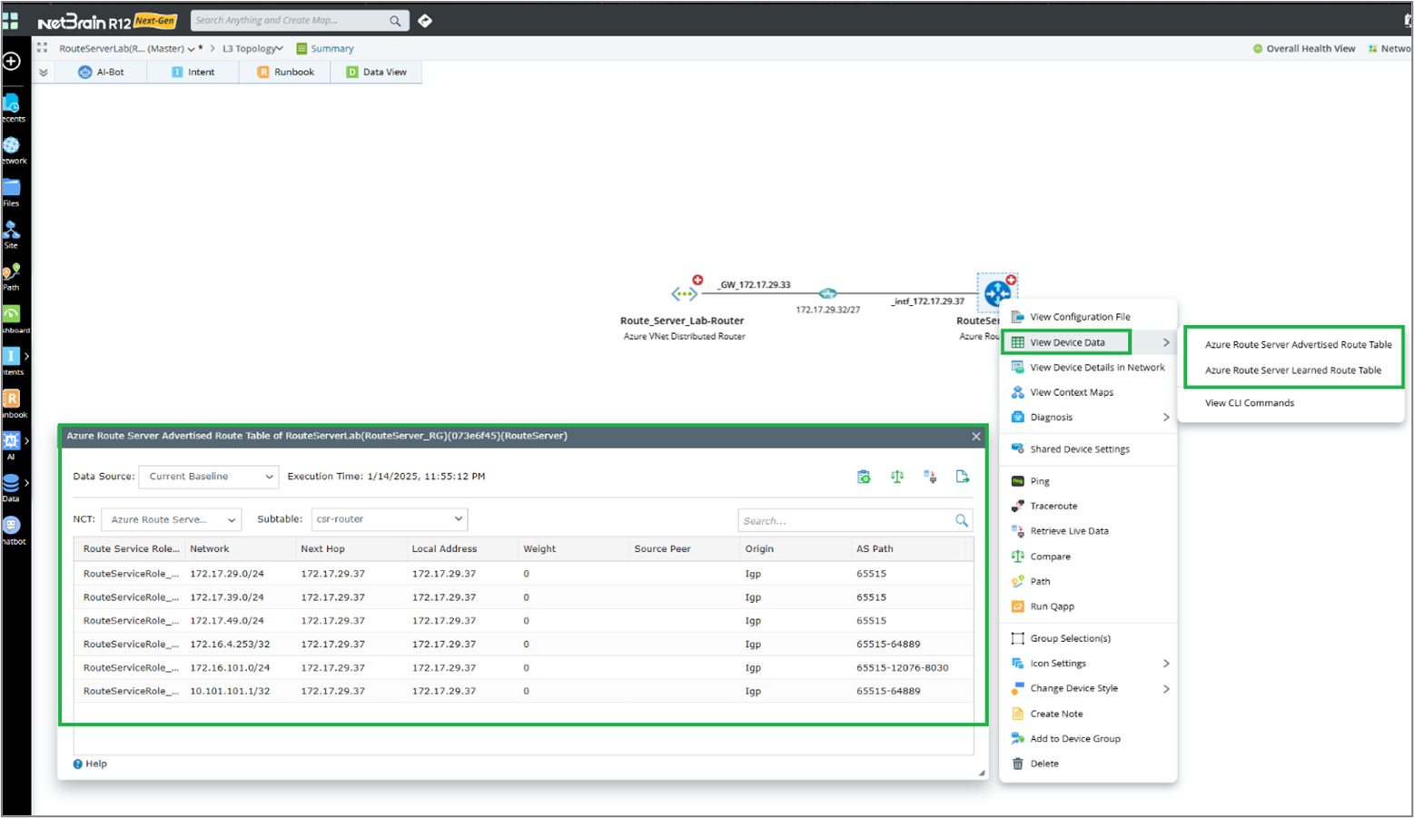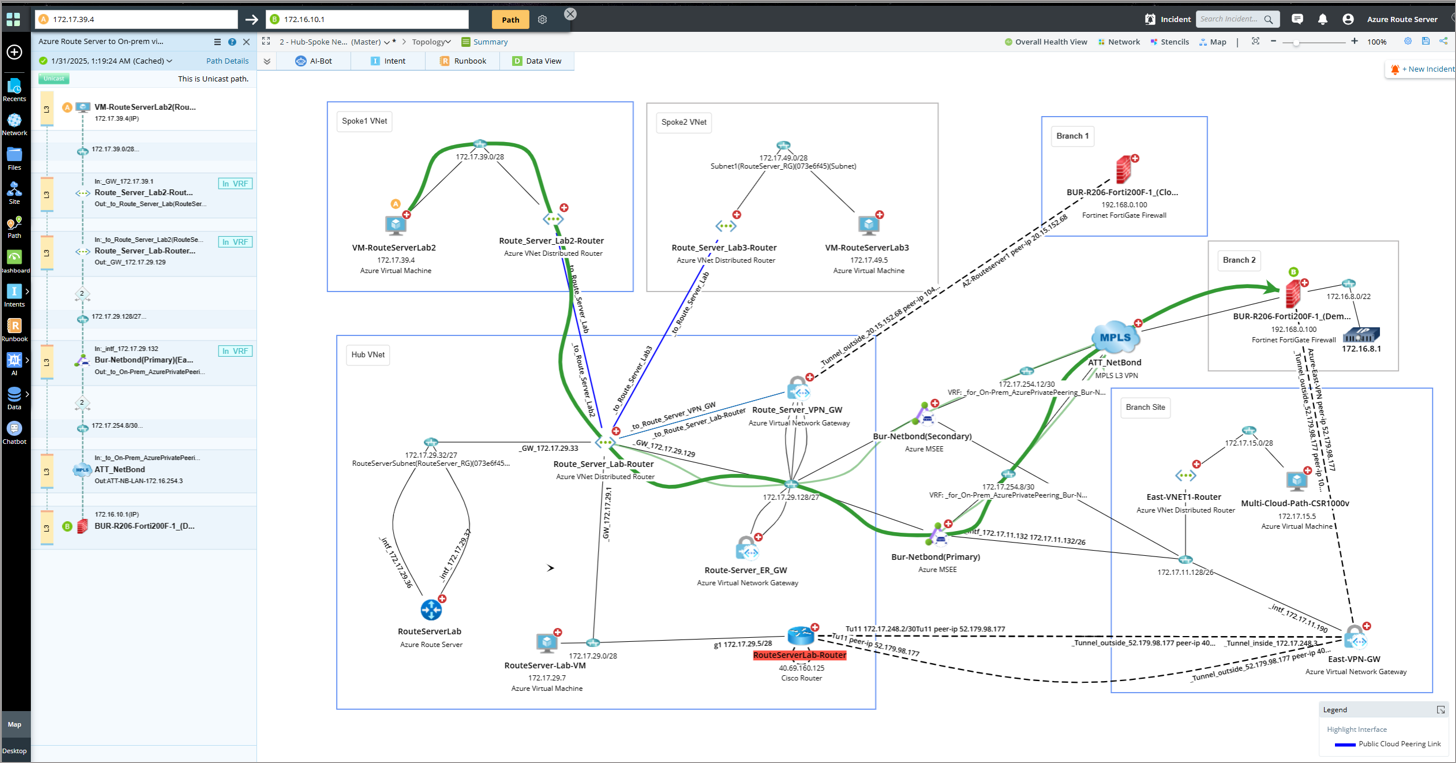- Neighbor Topology: NetBrain provides visibility and insights into your cloud network, including Azure Route Server connectivity and topology.