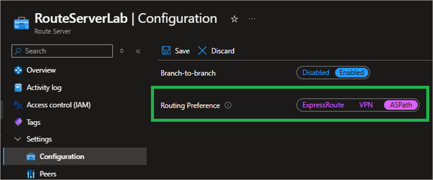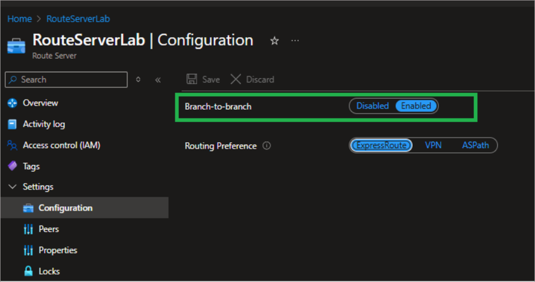 Enable branch-to-branch traffic path and configure route preferences to manage route learning and selection for the Azure Route Server.Branch-to-Branch Traffic Path: