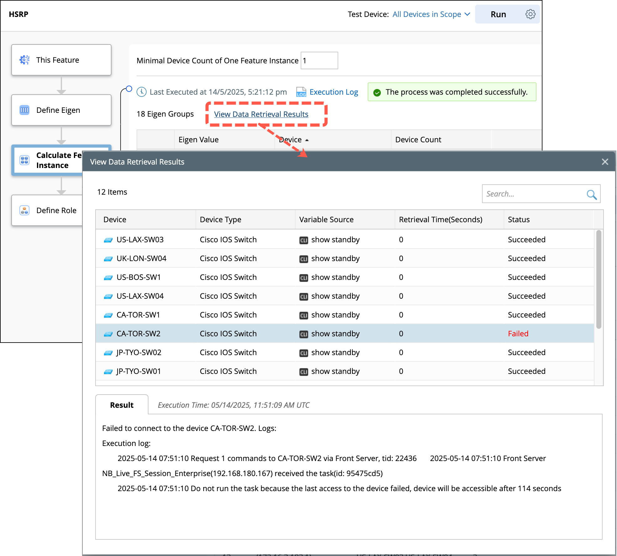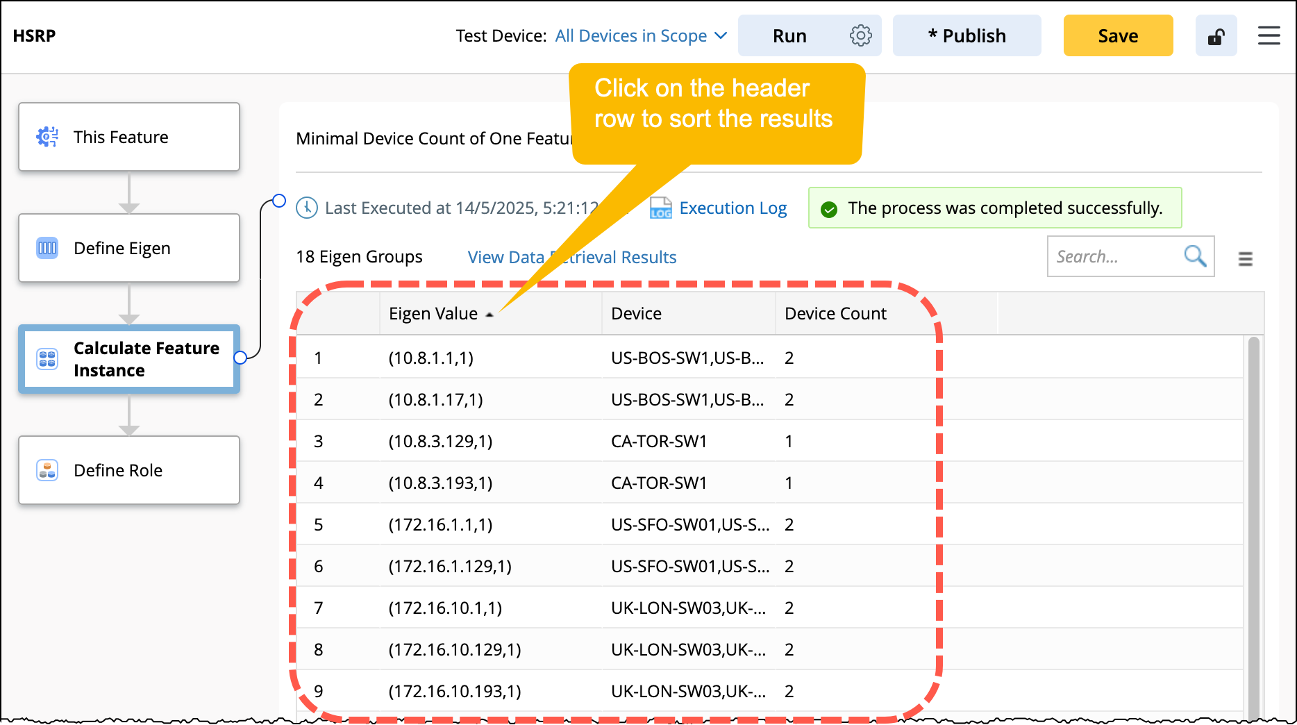 The primary function of this node is to select a subset of Test Devices for computing and debugging the Feature Instance. This process is based on the Eigen settings configured in earlier steps. By choosing specific Test Devices, users can focus on testing and refining the Feature Instance, ensuring it operates correctly before applying it more broadly across the network. The system will calculate Feature Instances by: