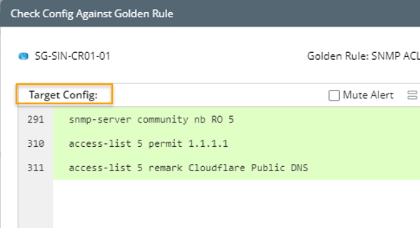 Copy Target config and Golden config: To document the target config or golden config and check the matched/unmatched lines later, hover over the config and click