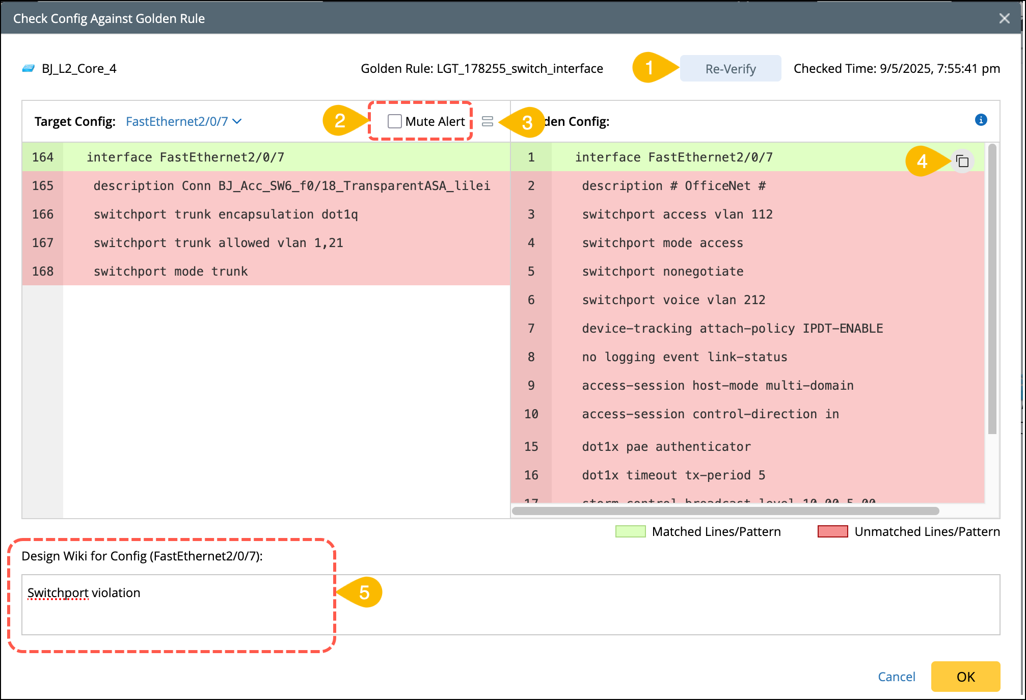 Check Config Against Golden Rule window will show the details of the config check results at instance level. It draws a comparison between instance's config-let lines of the device and the pattern defined in the Golden Config Template and identifies the matched and unmatched lines. You can manually verify the current Golden Config Rule in this window and get the latest results.