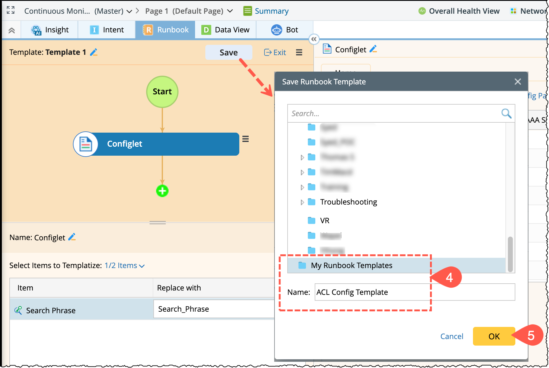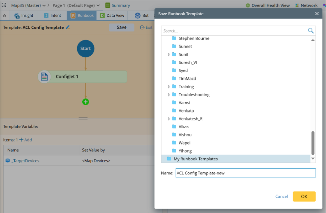 - Click Save, enter a name (e.g., "ACL Config Template") and select the folder for template location.