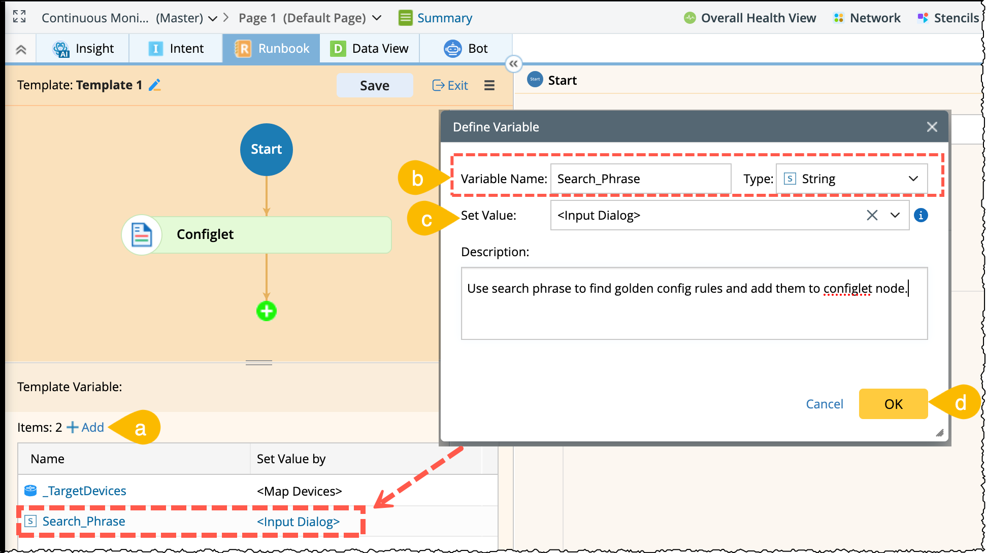 - Click the Start node and add a new runbook-level template variable: