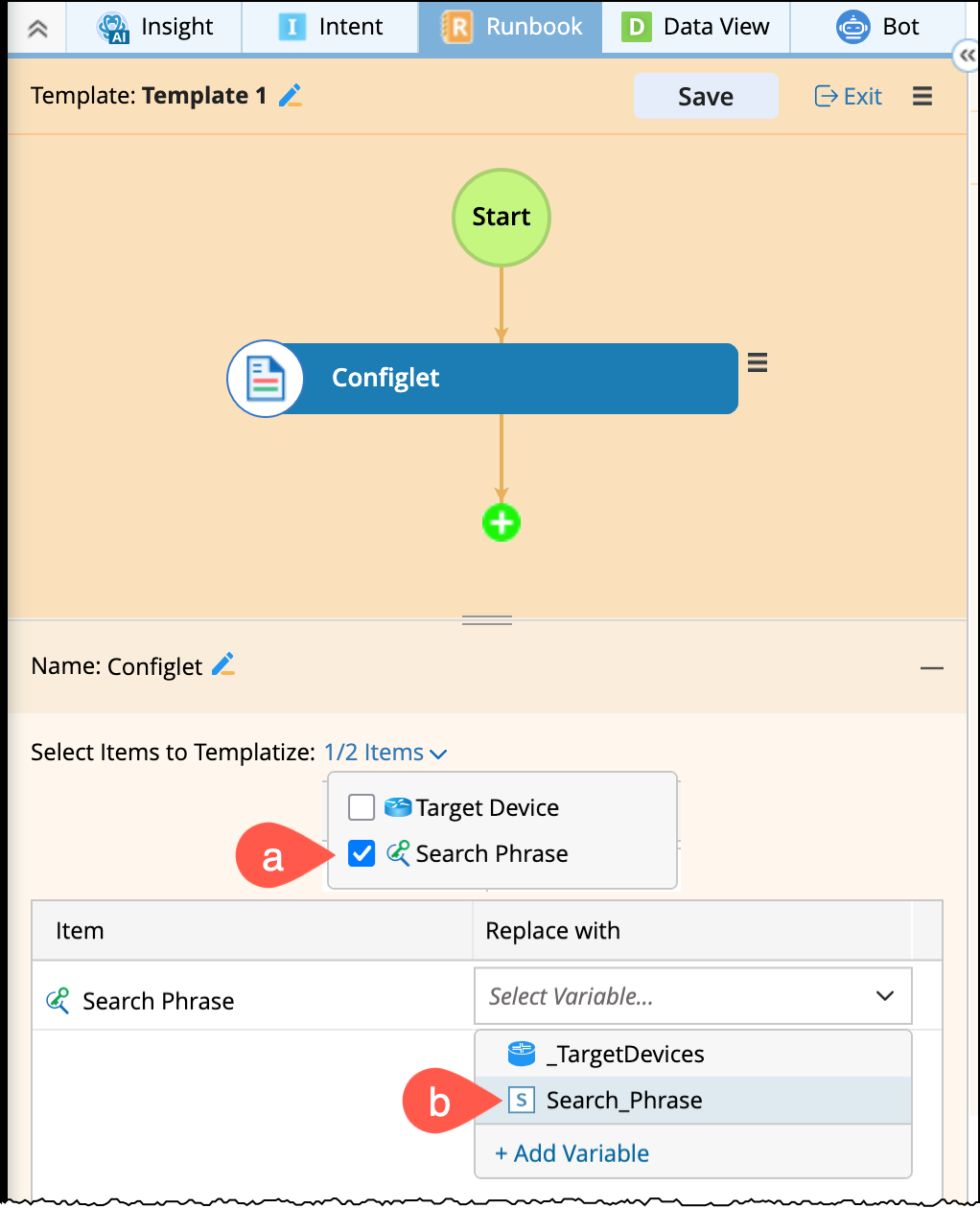 Save a runbook containing a well-defined Configlet node as a Template: