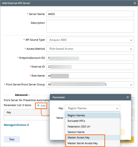 - Configure the parameters in the Add External API Server window as follows:
