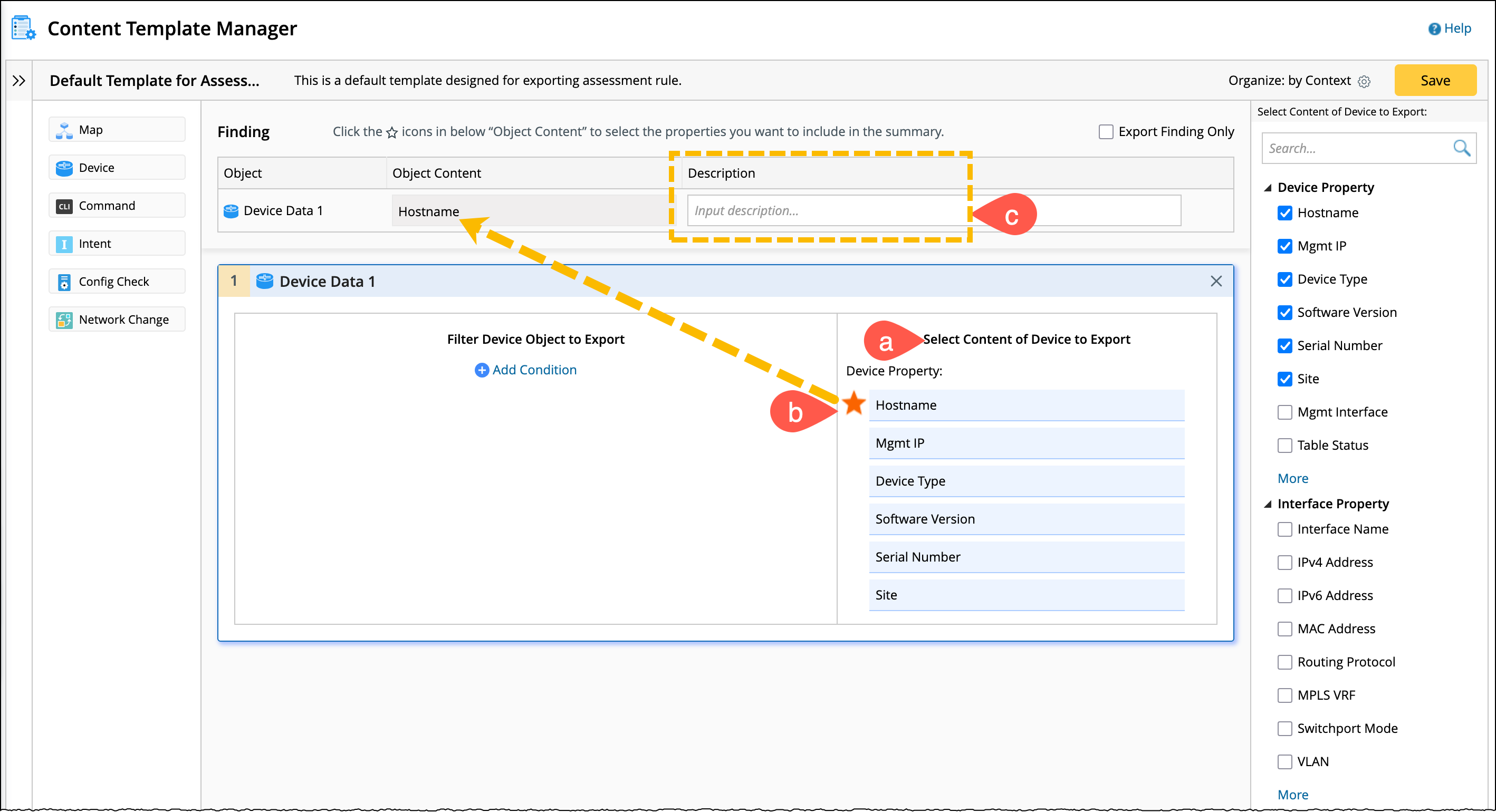 The template editor allows you to populate the content area with objects and findings. And define conditions to filter entries within the selected objects, followed with selection of properties for exporting the content.